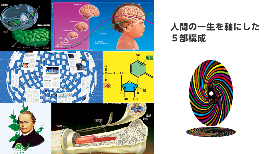 生命の歴史からヒトへの進化、ヒトの誕生から死までをたどりながら細胞成分などヒトのミクロの世界へ、